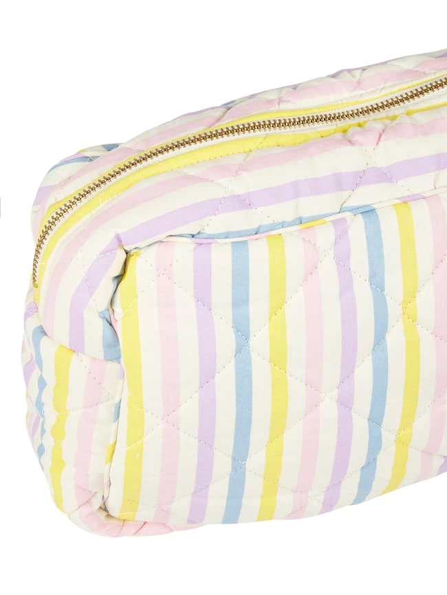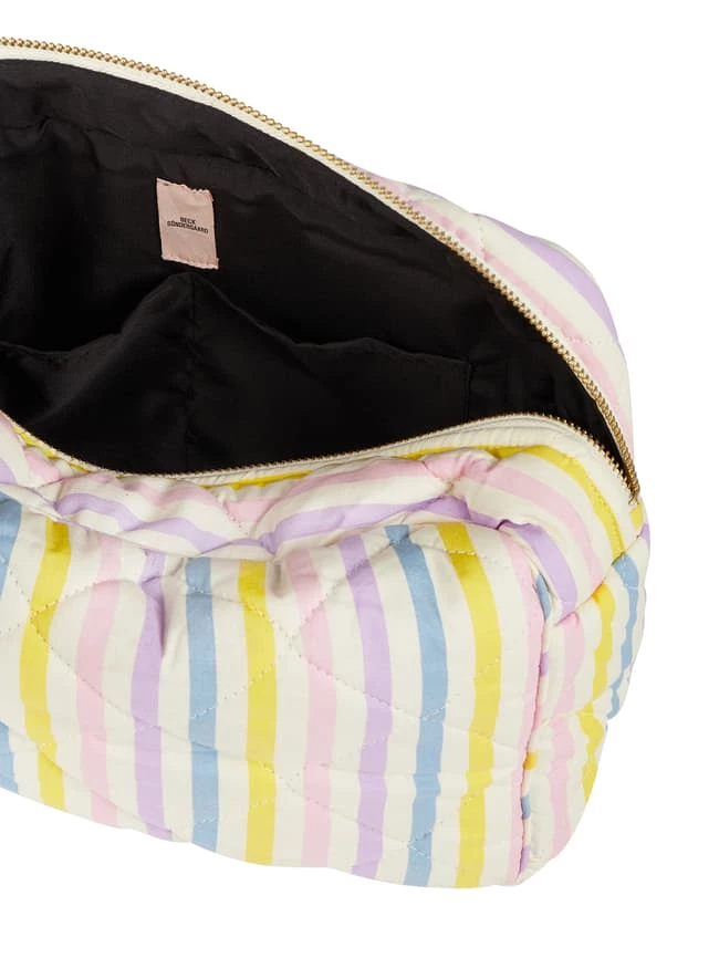 Der Kulturbeutel von Becksöndergaard ist aus reiner Baumwolle gefertigt. Er kommt mit Streifenmuster, Reißverschluss und vier Steckfächern.