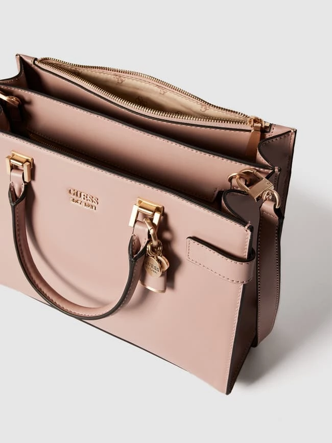 Die Handtasche von GUESS ist aus robustem Material gefertigt. Sie zeigt sich mit Brand-Details und geteiltem Hauptfach mit Reiß- und Magnetverschluss.