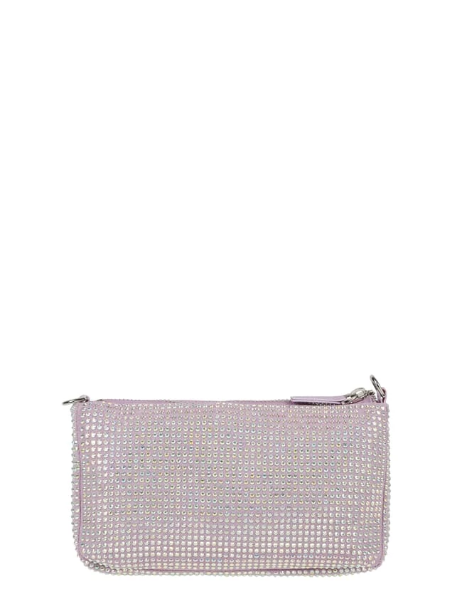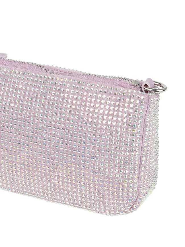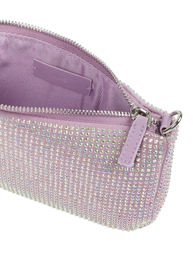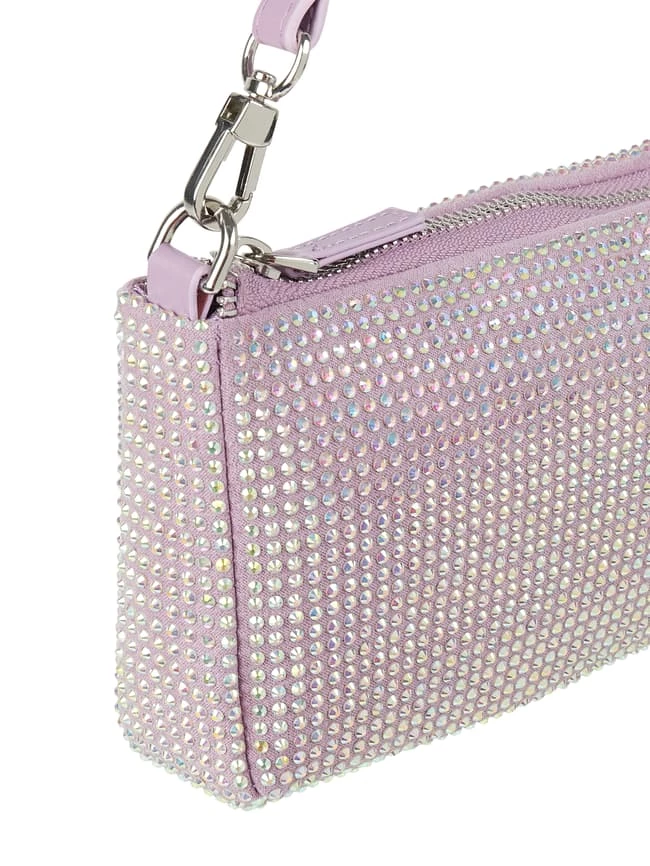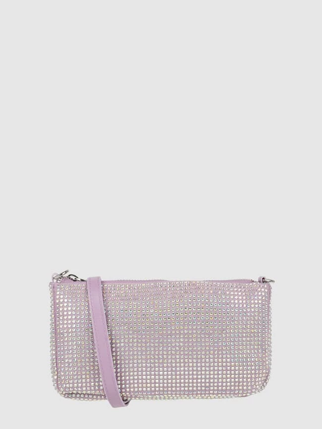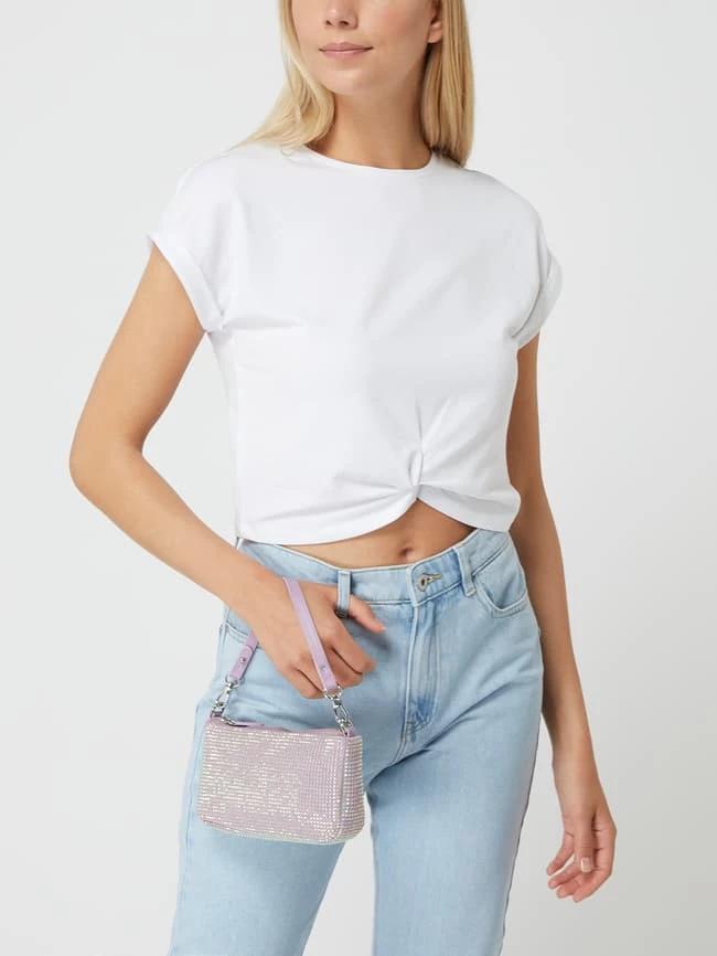 Die Pochette von MANGO ist aus Textil gefertigt. Sie zeigt sich mit abnehmbarem Trageriemen, Kontrastbesatz in Leder-Optik und Strasssteinen.