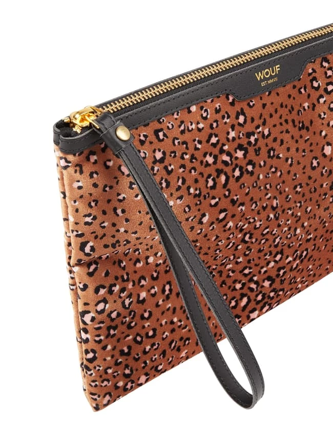 Die Pochette von WOUF ist aus Samt gefertigt. Sie zeigt sich mit Leopardenmuster, Trageschlaufe und Reißverschluss.